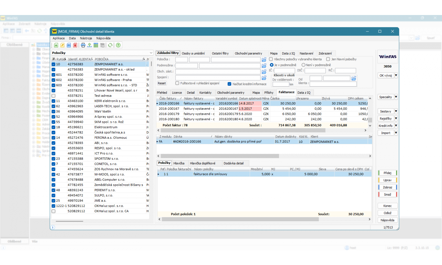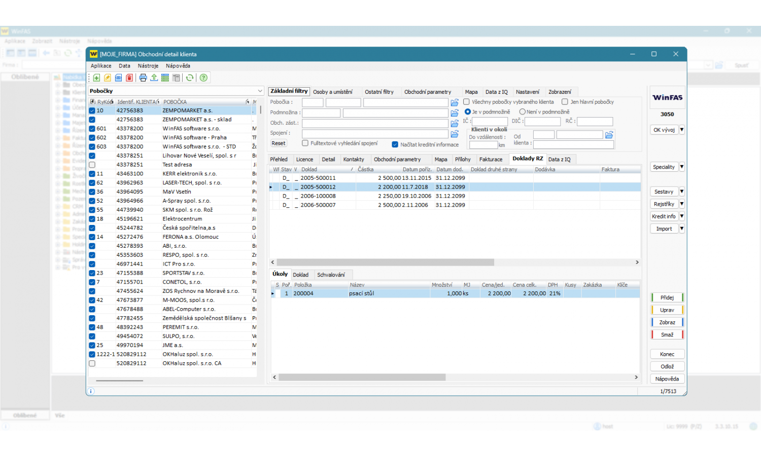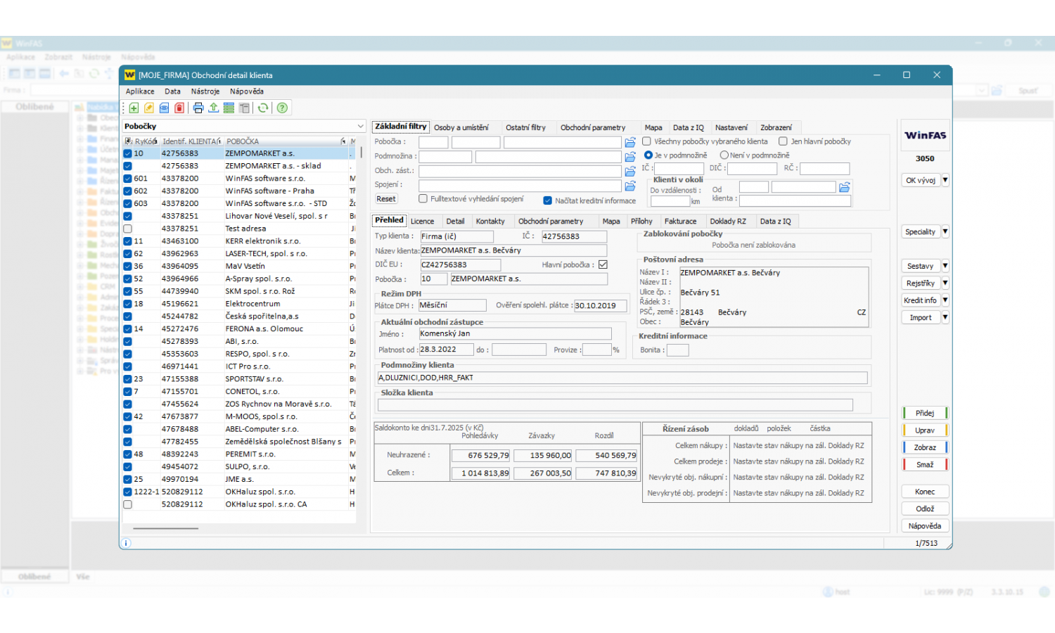 Tento modul nabízí další pohled data pořízená ve WinFASu. Běžný pohled je tzv. modulový - to namená, že na data se díváte ze strany konkrétního modulu (účetnictví, fakturace, sklady, ...). Naproti tomu Obchodní detail nabízí pohled ze strany klienta (odběratele / dodavatele) a to do všech modulů kde se s klientem pracuje. Modul je koncipována jako prohlížecí, slouží tedy primárně k náhledu do ostatních modulů, nikoliv k pořizování (některé úpravy jsou nicméně možné pomocí kontextových nabídek). V základu vám zobrazí detailní informace o vybraném klientovi / pobočce, pro něj nastavené obchodní parametry, kontaktní informace a záložky s daty z ostatních modulů.