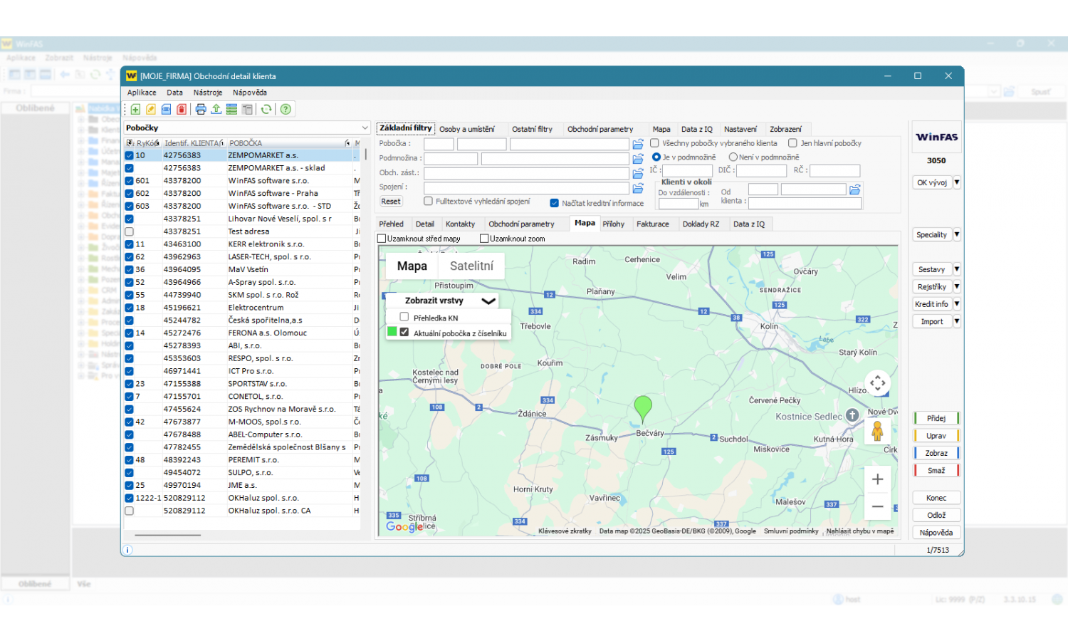 - zobrazení klienta v mapě, zobrazení dalších klientů ve zvoleném okruhu nebo oblasti (kraj, okres, ...)